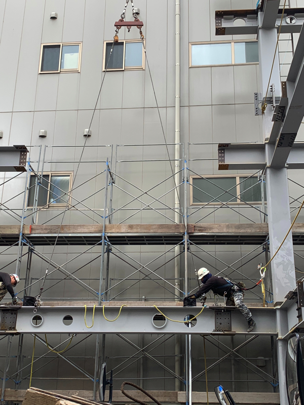 中でも鉄骨建方、ボルト入れ、デッキ貼り、鍛冶工事、鳶鍛冶などが主な業務になります。それぞれ建物を建設するには欠かせない工事になります。